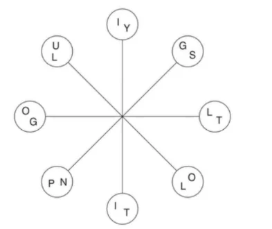 Work clockwise round the circles to spell out two eight-letter words that are synonyms. Each word commences in a different circle, and you must find the starting point of each. Every letter is